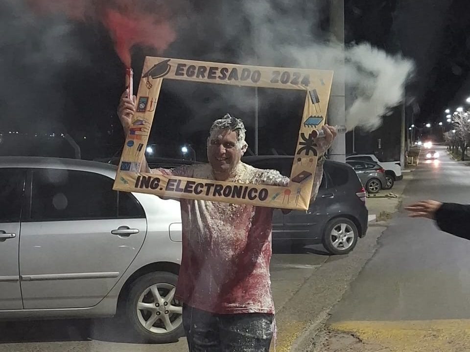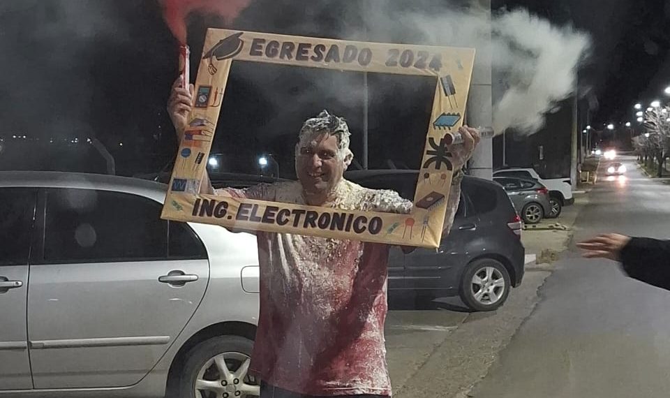 “Este 02 de agosto del año 2024, queremos saludar especialmente a Javier Alejandro Tapia que se recibió de INGENIERO ELECTRÓNICO. 🥳🥳🥳🥳”.