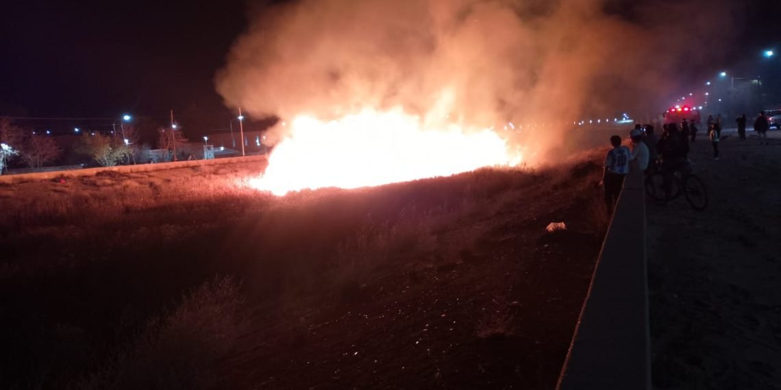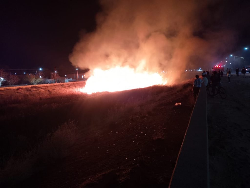 Un incendio de grandes dimeniones se desató esta noche en el zanjón colector de crecientes, cerca del puente Teresa Rodríguez, en Plaza Huincul.
