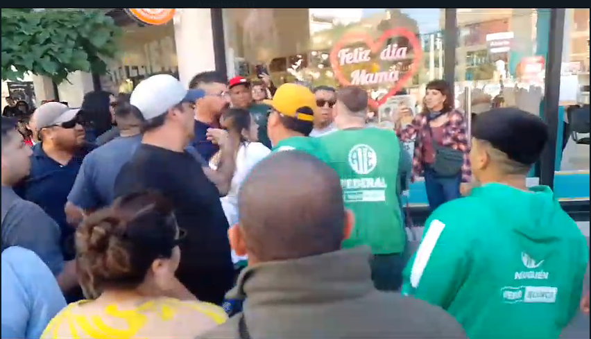 Un grupo importante de personas se unió a la asamblea con el cántido “el bono no es salario” y luego otras personas, identificadas con camperas verdes de ATE los corrieron. Hubo agresiones físicas.