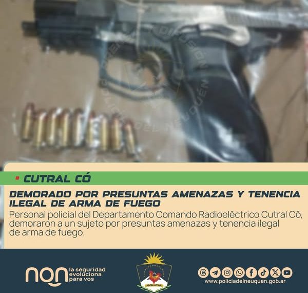 El hecho ocurrió el sábado por la noche, en un domicilio de la calle Río Chimenuin en el barrio Zani de Cutral Co. “El personal policial observa a un hombre que conducía un Jeep blanco que arrojó un elemento”, explicó el comisario inspector Pedro Güento. Agregó que: “resultó ser una pistola Bersa 9 milímetros con numeración limada”, indicó.