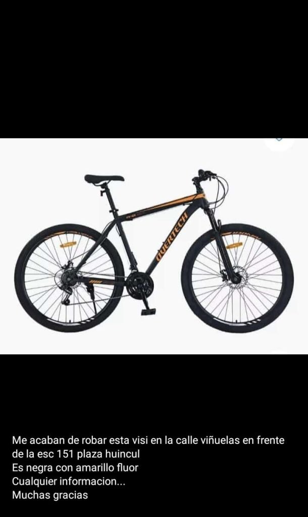 Una bicicleta fue robada en la calle Viñuelas, frente a la escuela N° 151 en Plaa Huincul. La bici s negra con amarillo fluo.
