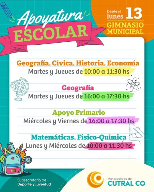 A partir del próximo lunes 13 de enero, el Gimnasio Municipal de Cutral Co ofrecerá un programa gratuito de apoyo escolar destinado a estudiantes de nivel primario y secundario. Esta iniciativa busca reforzar los conocimientos de los alumnos y prepararlos de manera óptima para sus desafíos académicos.
