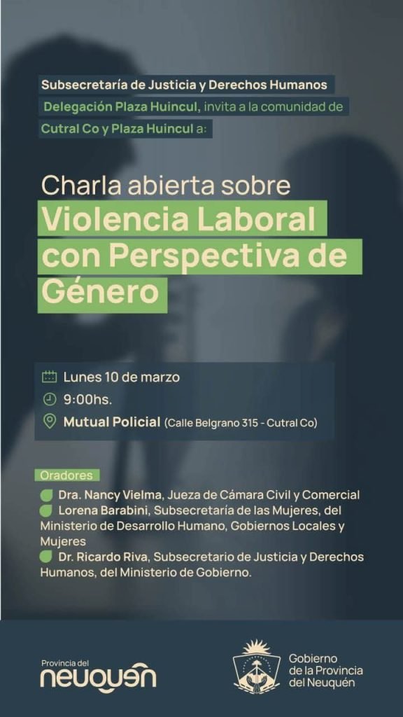 La subsecretaría de Justicia y Derechos Humanos, a través de su delegación en Plaza Huincul, invita a la comunidad de Cutral Co y Plaza Huincul a participar de una charla abierta sobre violencia laboral con perspectiva de género. El evento se llevará a cabo el lunes 10 de marzo a las 9:00 horas en la Mutual Policial, ubicada en Calle Belgrano 315 de la ciudad de Cutral Co.