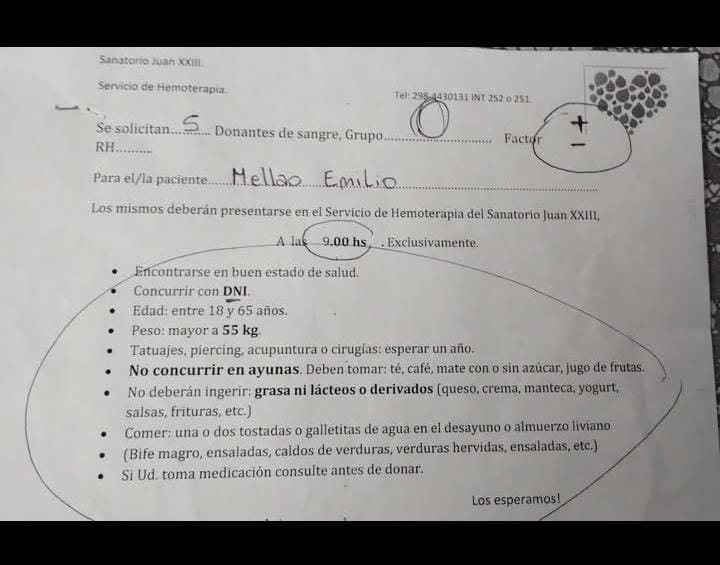 Se solicitan 5 donantes de sangre factor 0 ( + – ) , para Mellao Emilio, de Parque Oeste, quien será sometido a una cirugía de corazón.