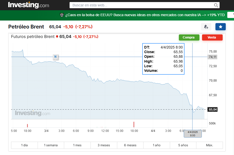 El precio de Brent para la entrega de junio caía un 2.97% hasta 68.06, su nivel más bajo desde diciembre de 2021. Por su parte el West Texas Intermediate (WTI) la referencia en Estados Unidos, para entrega en mayo, se hundía hasta 64,86% un mínimo desde mayo de 2023.