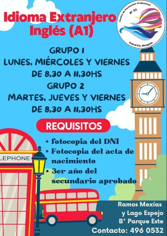 En el Centro de Formación Profesional N° 22 de Cutral Co continúa abierta la inscripción para estudiar idioma Inglés.