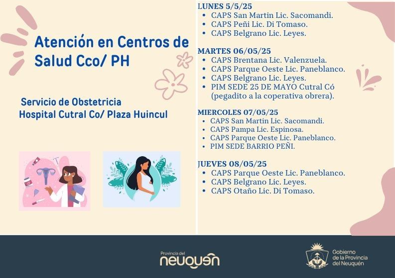 El hospital Cutral Co y Plaza Huincul informó el cronograma semanal de atención del Servicio de Obstetricia, que se desarrollará del lunes 5 al jueves 8 de mayo en distintos Centros de Atención Primaria de la Salud (CAPS) de ambas ciudades. Además, se ofrecerán cursos de preparación para la maternidad abiertos a todas las personas gestantes.
