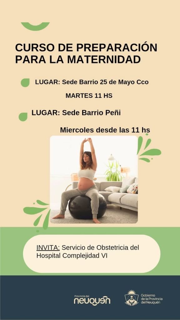 - Además, se desarrollará el curso pre parto “Preparación para la Maternidad” en la sede del barrio 25 de Mayo de Cutral Co. Se invita a embarazadas a participar solas o acompañadas, con ropa cómoda.