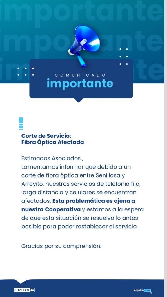 Desde la cooperativa Copelco se informó esta tarde que se produjo un corte en la fibra óptica. El motivo obedece a que se registró un corte de la fibra óptica entre Senillosa y Arroyito.