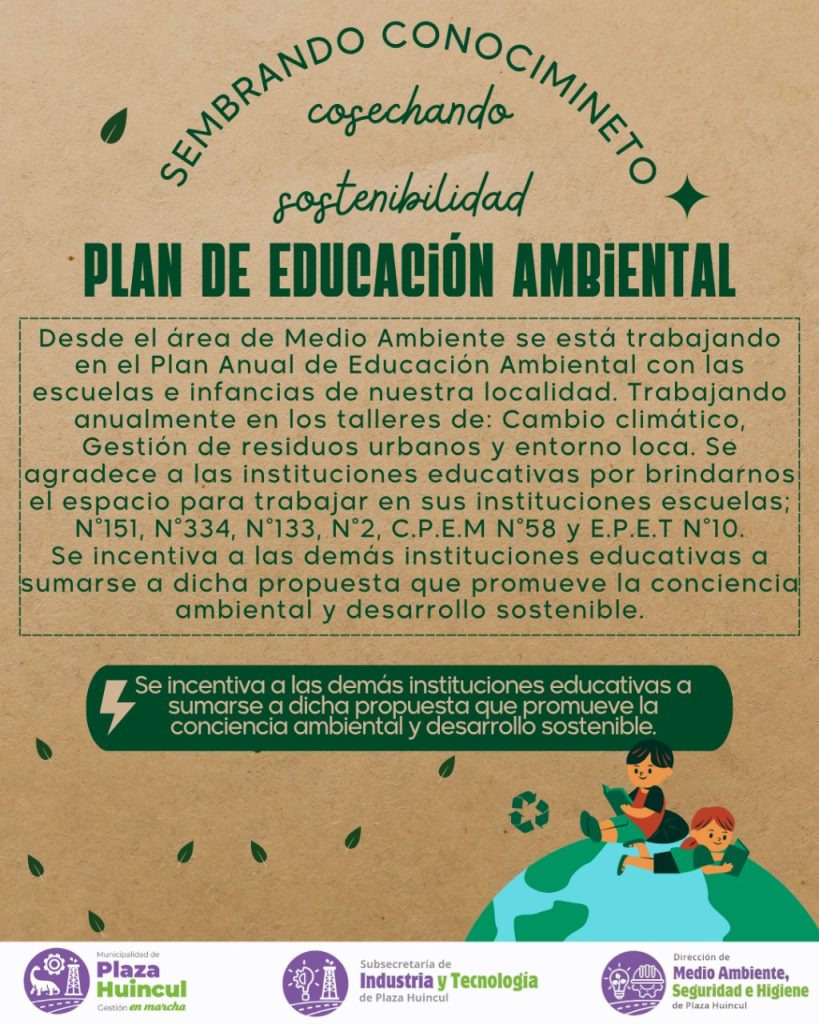 Plaza Huincul presentó el nuevo Plan de Educación Ambiental: “Un Futuro Sostenible para Nuestras Escuelas”, una propuesta que apunta a fortalecer la conciencia ambiental en el ámbito escolar mediante actividades educativas y acciones prácticas.