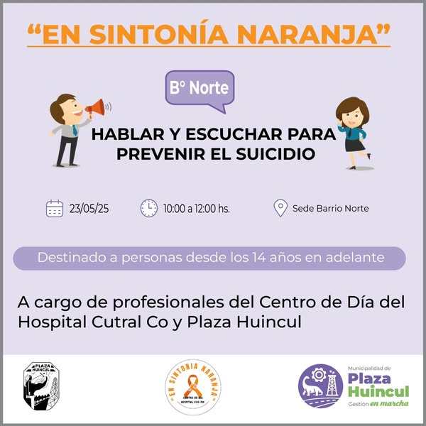 El próximo viernes 23 de mayo, se llevará a cabo en Barrio Norte de Plaza Huincul una jornada de sensibilización y prevención del suicidio bajo el lema “En Sintonía Naranja: Hablar y Escuchar para Prevenir el Suicidio”. La actividad se desarrollará de 10:00 a 12:00 horas en la sede barrial y está dirigida a personas a partir de los 14 años de edad.