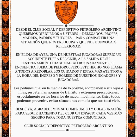 A la vez, el propio club más temprano solicitó también a las familias que mantengan un especial cuidado cuando llevan o retiran a las niñas, niños y adolescentes del espacio deportivo.