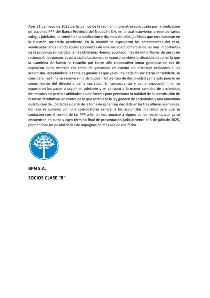 Esta semana hubo una reunión informativa que fue convocada por la sindicación de acciones PPP del Banco Provincia del Neuquén y a la que asistieron también jubilados, socios clase B que tienen estas acciones, junto a los asesores legales.