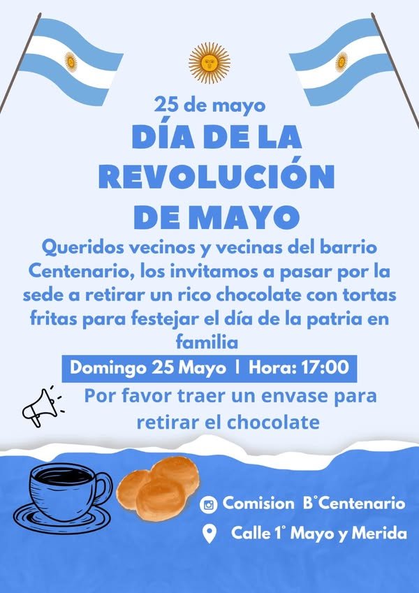 El domingo 25 de mayo, la comisión del barrio Centenario invita a todos los vecinos y vecinas a conmemorar el Día de la Revolución de Mayo con un encuentro familiar en la sede del barrio, ubicada en calle 1° de Mayo y Mérida.