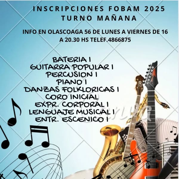 (FOBAM) anunció la apertura de inscripciones para el ciclo 2025, destinadas al turno mañana. La propuesta formativa incluye una amplia oferta de talleres orientados a niñas, niños, adolescentes y personas adultas interesadas en la iniciación musical y artística.