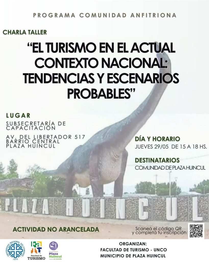 En el marco del Programa Comunidad Anfitriona, el próximo jueves 29 de mayo se dictará en Plaza Huincul un nuevo taller abierto a toda la comunidad, bajo el título “El turismo en el actual contexto nacional: tendencias y escenarios probables”. La jornada se desarrollará de 15:00 a 18:00 horas en la sede de la subsecretaría de Capacitación, ubicada en Avenida del Libertador 517, en el barrio Central.