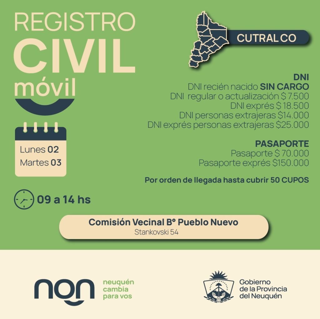 El Registro Civil Móvil llegará a Cutral Co con el objetivo de facilitar la realización de trámites documentarios a los vecinos y vecinas de la ciudad. La atención se brindará los días lunes 2 y martes 3 de junio, de 9:00 a 14:00 horas, en la sede de la Comisión Vecinal del barrio Pueblo Nuevo, ubicada en calle Stankovski 54.