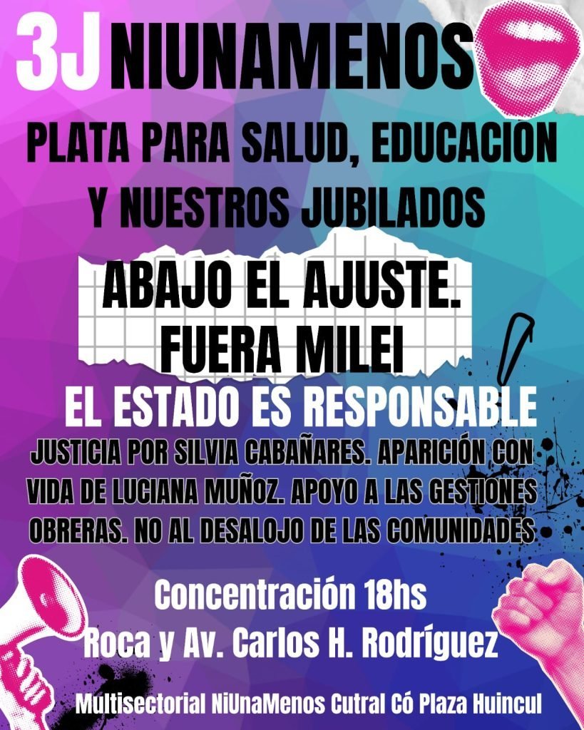 Una de ellas es una concentración, a partir de las 18, en Carlos H. Rodríguez y Roca. Esta iniciativa convoca la Multisectorial Ni Una Menos, y entre las demandas reclamaron por Silvia Cabañares y por la aparición de Luciana Muñoz, la joven neuquina que desapareció y de la que todavía no se ha dado con su paradero, a pesar de los constantes reclamos de su familia y las organizaciones que la acompañan.