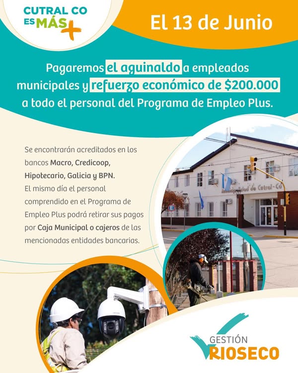 La municipalidad de Cutral Co anunció que el próximo jueves 13 de junio se realizará el pago del primer medio aguinaldo correspondiente al año 2025 para todo el personal municipal.