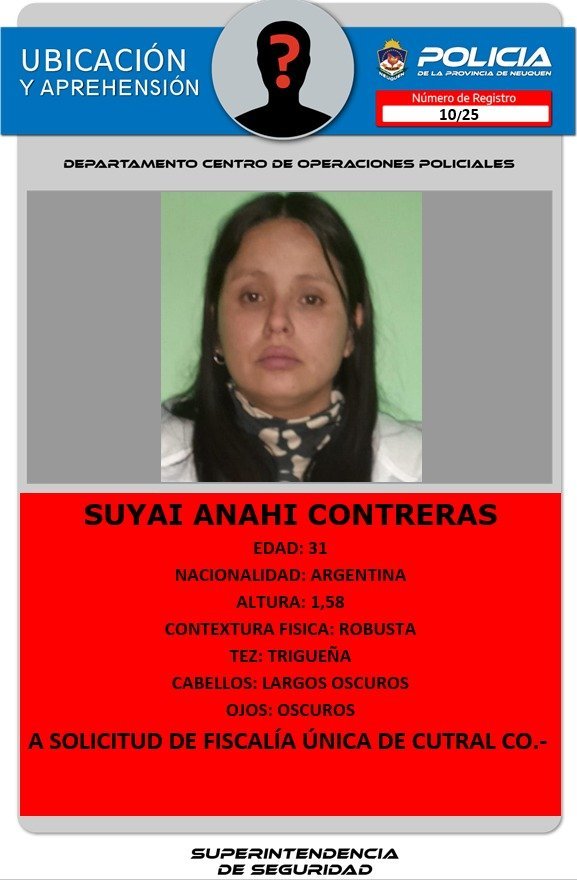 Se trata de Suyai Anahí Contreras, de 31 años, de nacionalidad argentina. En cuanto a sus características físicas se indicó que mide 1,58 metros de altura, de contextura física robusta, con tez trigueña y el pelo largo y oscuro. Ojos también oscuros.