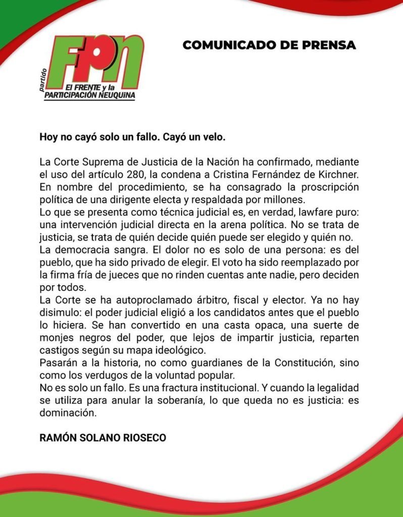 El texto que firma el actual intendente de Cutral Co y dirigente del FyPN, Ramón Rioseco se indica que lo que se presenta como técnica judicial es lawfare puro: “es una intervención judicial directa en la arena política. No se trata de justicia, se trata de quién decide quien puede ser elegido y quién no”.