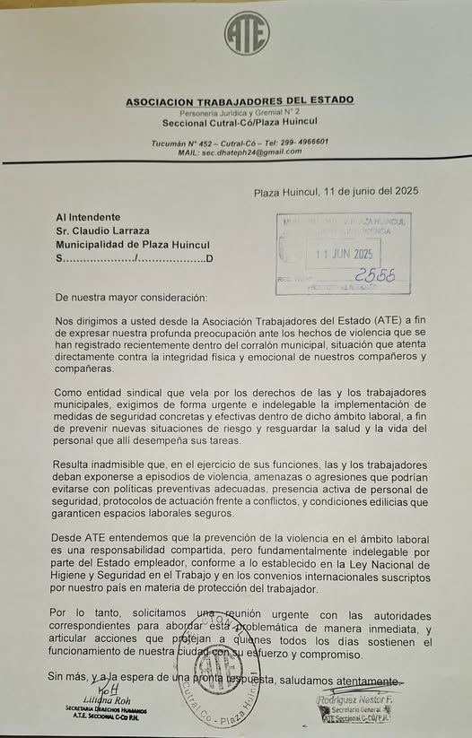 En una reunión mantenida este martes, representantes de la Asociación de Trabajadores del Estado (ATE) de Plaza Huincul se encontraron con funcionarios del Ejecutivo Municipal para abordar temas vinculados a las condiciones laborales del personal municipal, con especial foco en los recientes hechos de violencia registrados en el Corralón.