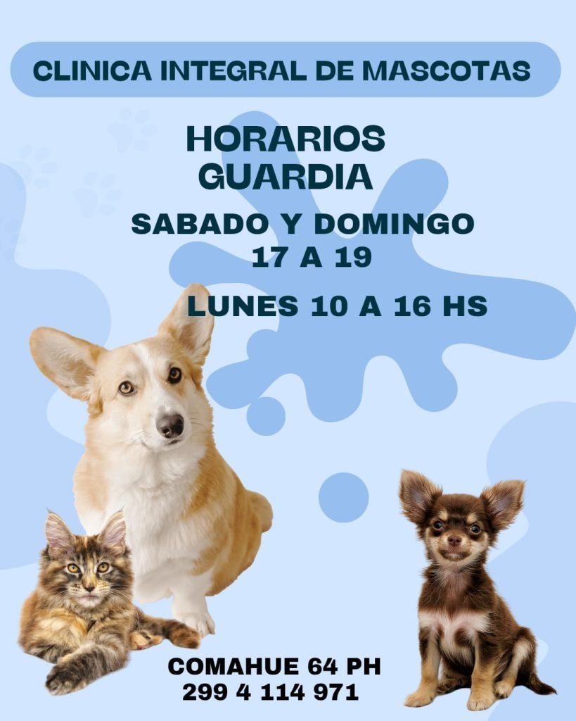La veterinaria de guardia para hoy es la Clínica Integral de Mascotas, que se ubica en Comahue N° 64 de Plaza Huincul.