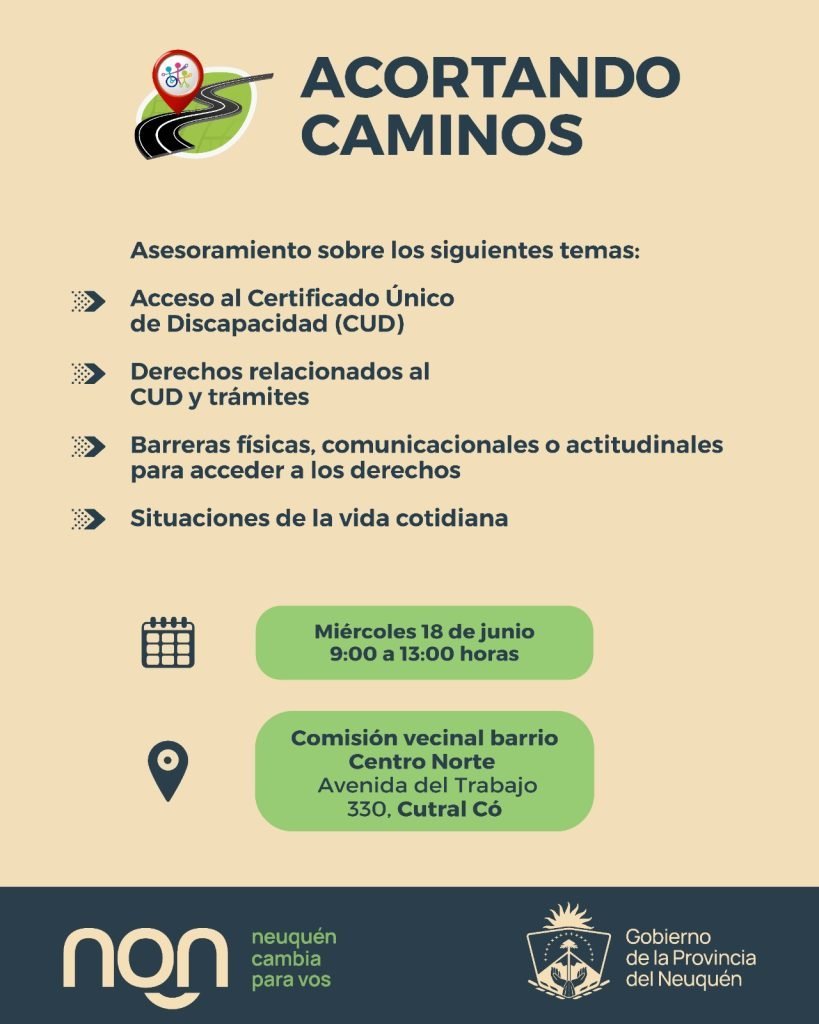 Este miércoles 18, desde las 9 hasta las 13, se llevará adelante una jornada denominada Acortando Caminos y que se hará en la sede del barrio Centro Norte de Cutral Co.