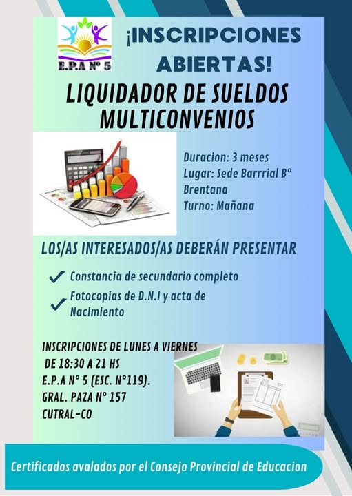 La Escuela de Educación Permanente para Adultos (EPA) N°5 de Cutral Co informó que ya se encuentran abiertas las inscripciones para el curso de Liquidador de Sueldos Multiconvenios, una capacitación de corta duración orientada a quienes buscan adquirir herramientas laborales concretas y actualizadas.