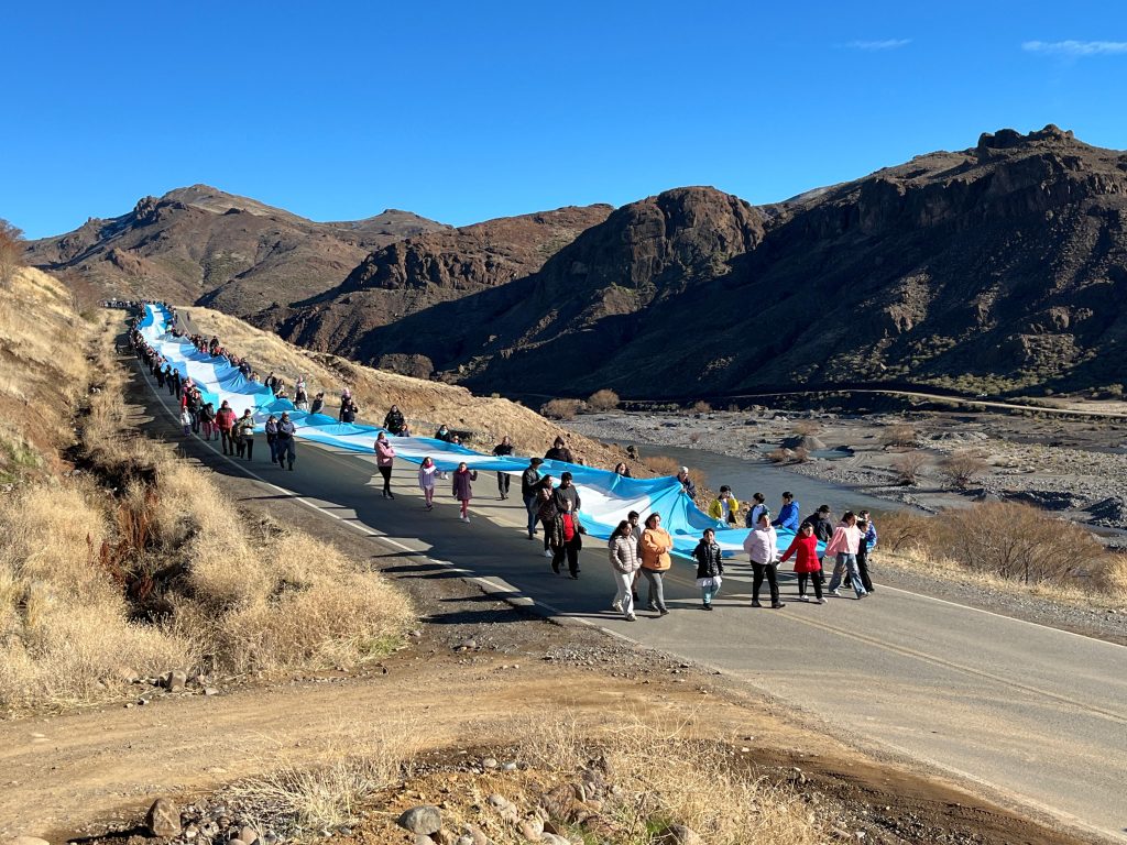 Con más de 500 metros de extensión, la enseña nacional recorrió las calles del pueblo y alcanzó el puente sobre el río Neuquén, en una postal cargada de simbolismo y emoción.