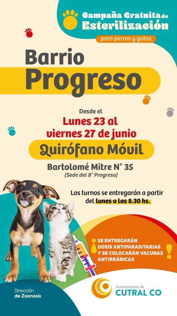 La dirección de Zoonosis de Cutral Co realizará una nueva campaña gratuita de esterilización de mascotas del lunes 23 al viernes 27 de junio. El quirófano móvil se instalará en la sede barrial del barrio Progreso, ubicada en Bartolomé Mitre N° 35.