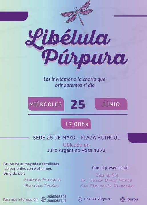 El próximo miércoles 25 de junio a las 17:00 horas, el Grupo Libélula Púrpura llevará adelante una charla informativa y de acompañamiento destinada a familiares de personas que transitan la enfermedad de Alzheimer. El encuentro se realizará en la sede 25 de Mayo, ubicada en Julio Argentino Roca 1372, Plaza Huincul.