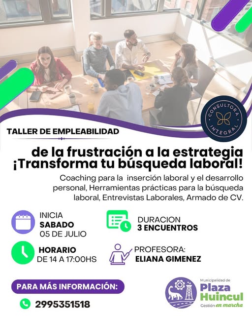 Con el objetivo de brindar herramientas prácticas y acompañamiento en el proceso de búsqueda de empleo, el sábado 5 de julio se pondrá en marcha en Plaza Huincul el Taller de Empleabilidad: De la frustración a la estrategia.