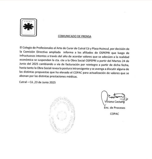 El Colegio de Profesionales del Arte de Curar (COPAC) de Cutral Co y Plaza Huincul informó que, a partir del martes 24 de junio, se suspende la atención por cuenta corriente a los afiliados de la obra social OSPEPRI. La decisión fue tomada por la Comisión Directiva Ampliada del organismo, tras considerar que no se lograron avances en las negociaciones para actualizar los valores que se pagan por las prestaciones médicas.