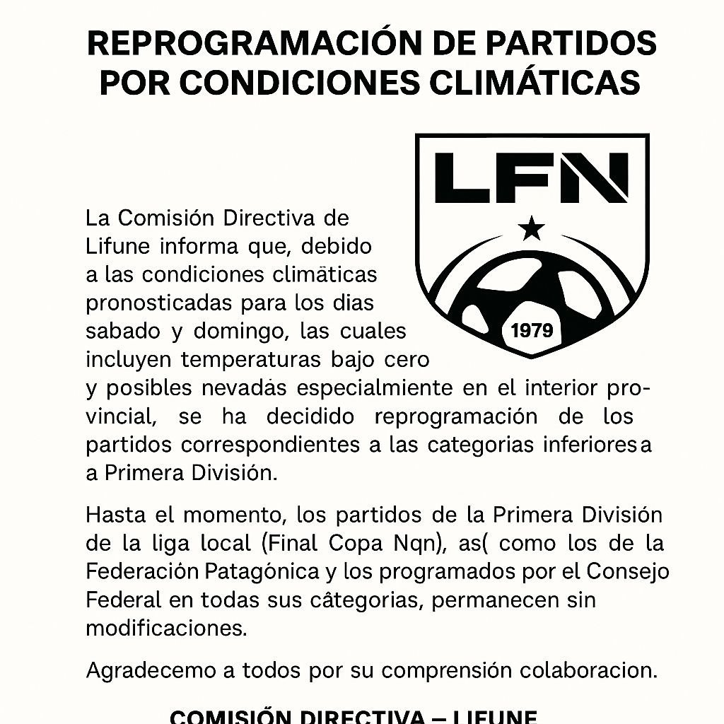 En la jornada de ayer la Liga de Fútbol del Neuquén emitió un comunicado en sus redes sociales informando que se suspendían todas la finales para el fin de semana.