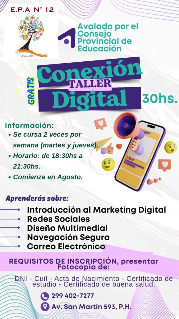 (E.P.A.) N° 12 anunció la apertura de inscripciones para el taller “Conexión Digital”, una propuesta formativa totalmente gratuita, avalada por el Consejo Provincial de Educación y orientada a fortalecer las competencias tecnológicas de jóvenes y adultos de la comunidad.