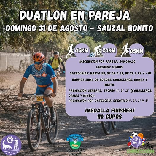 El próximo domingo 31 de agosto, la localidad de Sauzal Bonito será sede de una nueva edición del Duatlón en Pareja, una competencia que combina atletismo y ciclismo, y que promete reunir a duplas de distintos puntos de la región.