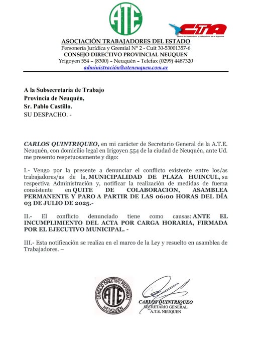 La notificación formal fue enviada a la subsecretaría de Trabajo provincial y lleva la firma del secretario general de ATE Neuquén, Carlos Quintriqueo. En el documento, se señala que la decisión se adoptó “en el marco de la ley y con mandato de los trabajadores”.