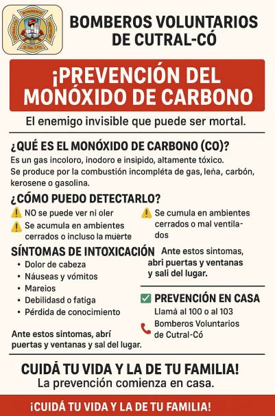 En la temporada invernal y ante el aumento del uso de artefactos de calefacción en los hogares, el cuerpo de Bomberos Voluntarios de Cutral Co lanzó una campaña informativa destinada a concientizar a la comunidad sobre los peligros del monóxido de carbono (CO), un gas altamente tóxico que puede causar graves daños a la salud e incluso la muerte.