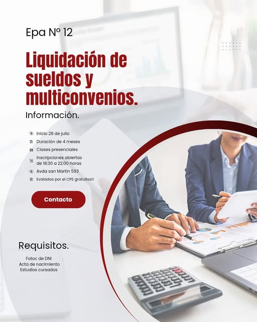 EPA 12 anunció la apertura de inscripciones para un nuevo curso gratuito de Liquidación de Sueldos y Multiconvenios, destinado a personas interesadas en capacitarse en temas laborales y administrativos.