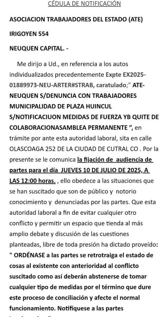 La citación se formalizó a través del expediente caratulado: “ATE-Neuquén s/denuncia con trabajadores Municipalidad de Plaza Huincul s/notificación medidas de fuerza y quite de colaboración – asamblea permanente”.
