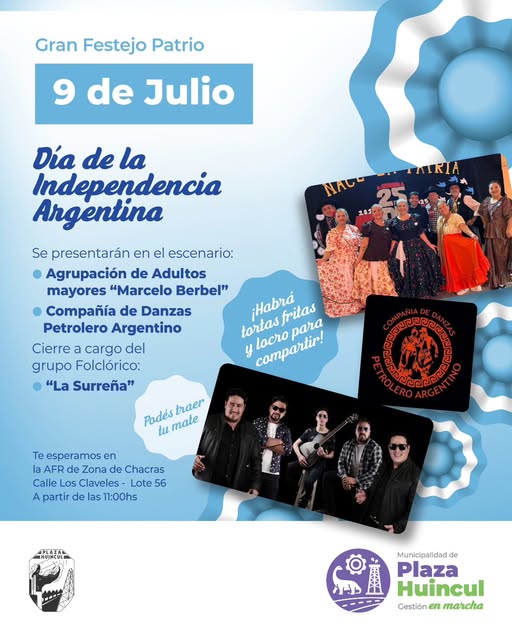 Plaza Huincul anunció la realización del acto y festejo por el Día de la Independencia, que tendrá lugar el próximo miércoles 9 de julio a las 11:00 horas en la Asociación de Fomento Rural (AFR), ubicada en Los Claveles, Lote 56, en la Zona de Chacras.