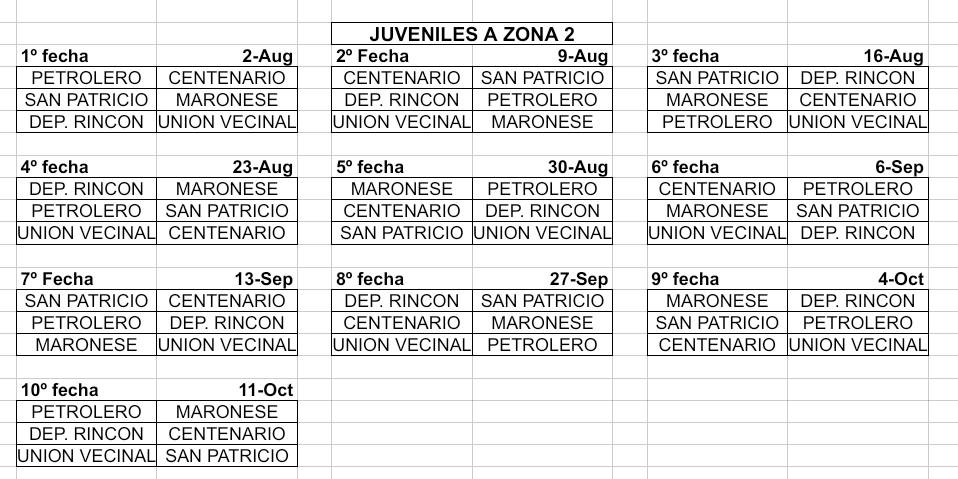 Petrolero Argentino se encuentra en la Zona B y comparte grupo con Centenario, San Patricio, Maronese, Deportivo Rincón y Unión Vecinal.