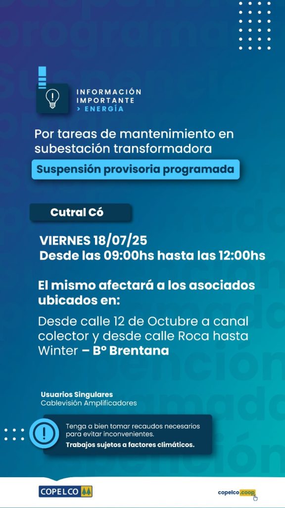 La cooperativa Copelco informó que este viernes 18 de julio de 2025 se llevará a cabo una suspensión provisoria del suministro eléctrico en la ciudad de Cutral Co, como parte de tareas programadas de mantenimiento en una subestación transformadora.