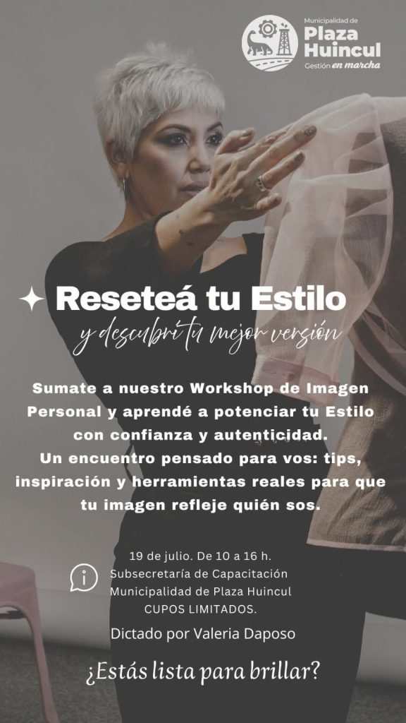 Se informó que, a través de la Subsecretaría de Capacitación del municipio de Plaza Huincul, se lanzó una nueva propuesta: el workshop de imagen personal “Reseteá tu estilo”, un espacio pensado para quienes deseen redescubrir y potenciar su estilo, con Valeria Daposo.