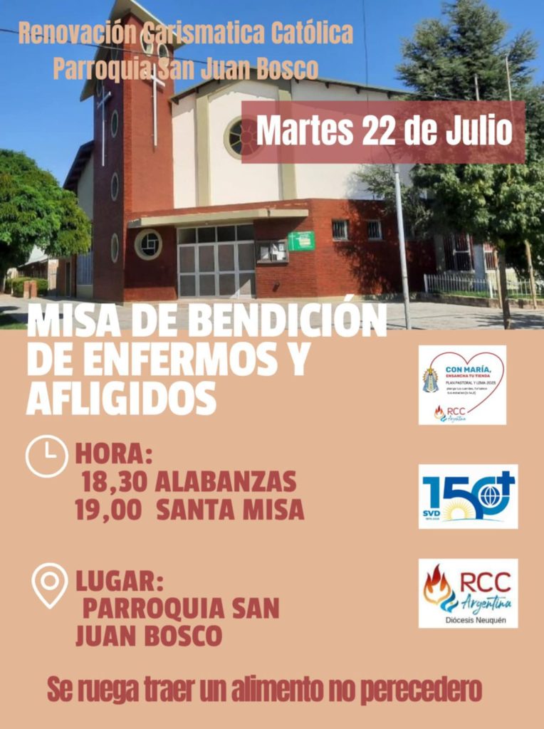 La Misa de Bendición de Enfermos y Afligidos se celebrará este martes 22 de julio en la sede parroquial ubicada en Cutral Co. La jornada comenzará a las 18:30 con alabanzas, y continuará a las 19:00 con la Santa Misa.