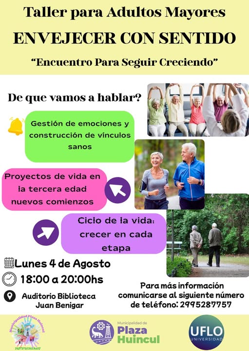 Plaza Huincul invita a la comunidad a participar del taller gratuito para adultos mayores denominado “Envejecer con Sentido – Encuentro para Seguir Creciendo”, que se llevará a cabo el próximo lunes 4 de agosto, de 18:00 a 20:00 horas, en el Auditorio de la biblioteca Juan Benigar.