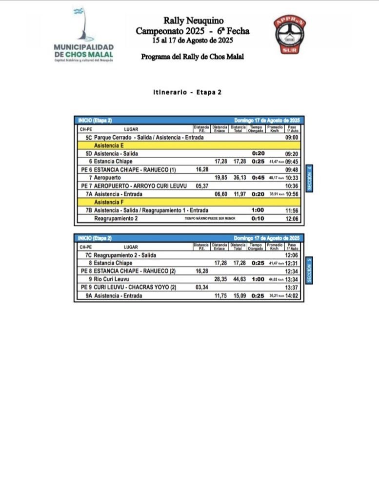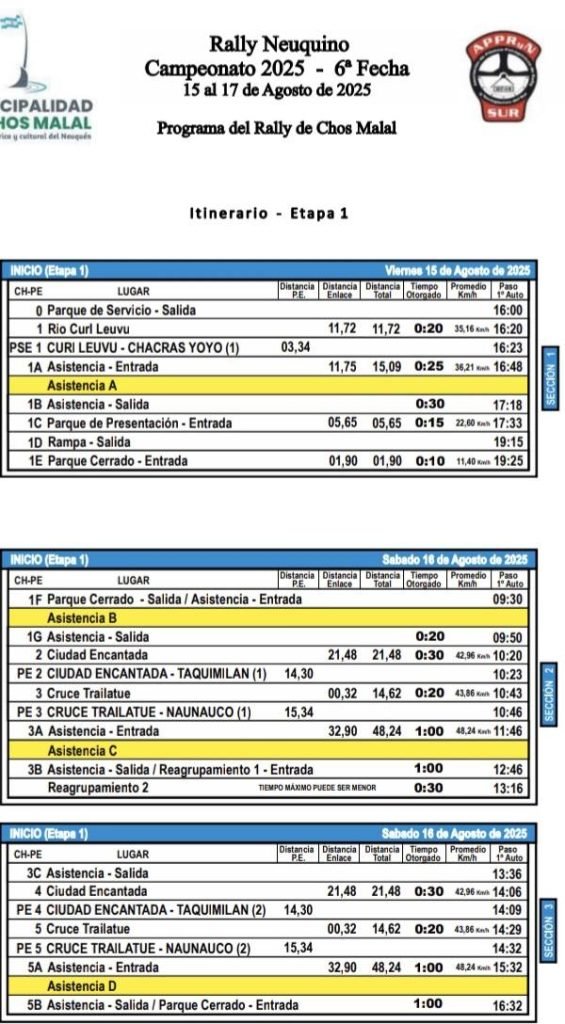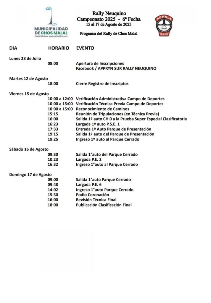 A falta de más de dos semanas, ya tenemos cómo se va a organizar la sexta fecha del campeonato a disputarse en Chos Malal. La competencia comienza el día viernes con la Prueba Súper Especial (P.S.E) a las 16:23 en el tramo Curi Leuvu – Chacras Yoyo. Luego 19 horas será la rampa simbólica.