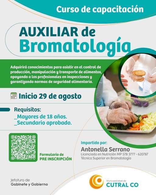 La municipalidad local invita a la comunidad a preinscribirse en la nueva capacitación para Auxiliar de Bromatología, un curso técnico diseñado para brindar herramientas en el control y supervisión de la producción, manipulación, transporte y expendio de alimentos.