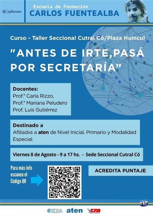 El encuentro lleva por título “Antes de irte, pasá por Secretaría” y estará a cargo de un equipo docente conformado por la profesora Carla Rizzo, la profesora Mariana Peludero y el profesor Luis Gutiérrez. La propuesta busca ofrecer una jornada de formación intensiva que combine teoría y práctica, abordando temáticas claves del trabajo pedagógico y sindical en el contexto actual.